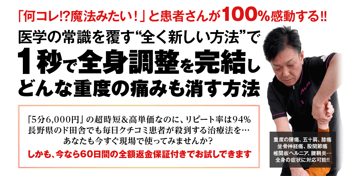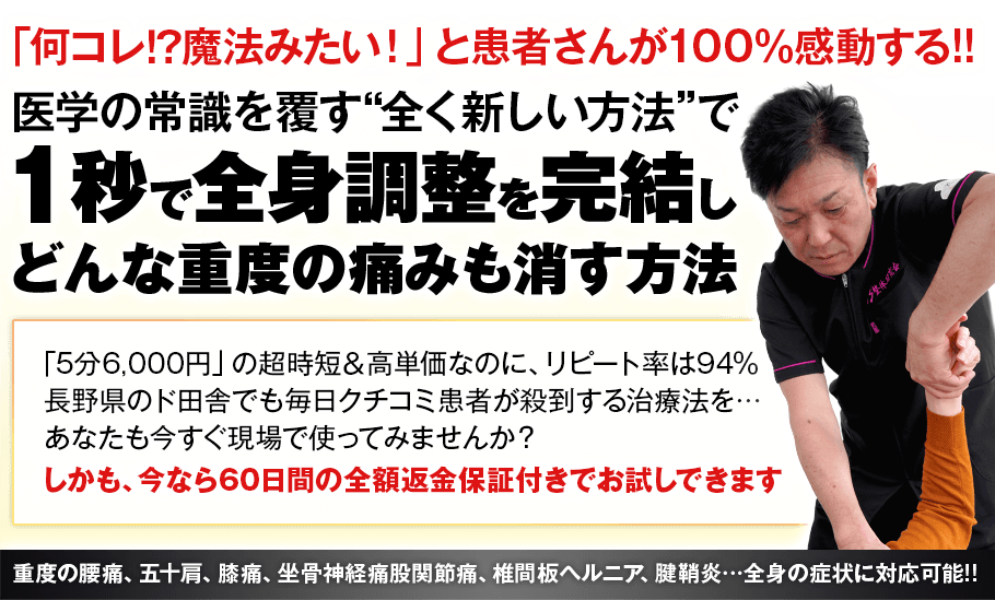 この施術を患者さんに施すだけで、患者さんはあまりの短時間で体が変化したことに驚き、あなたの腕に全幅の信頼をおいてくれるようになります。