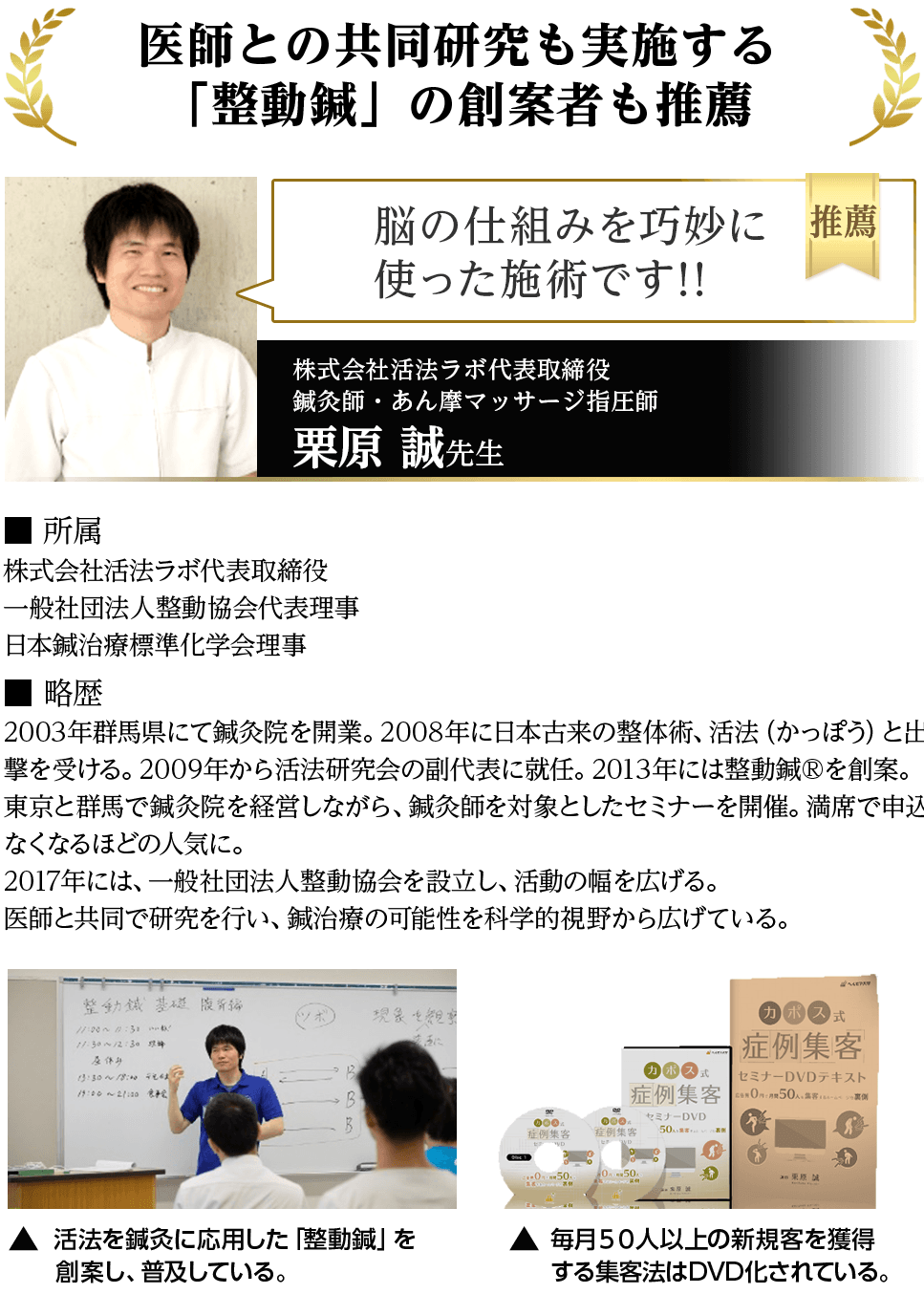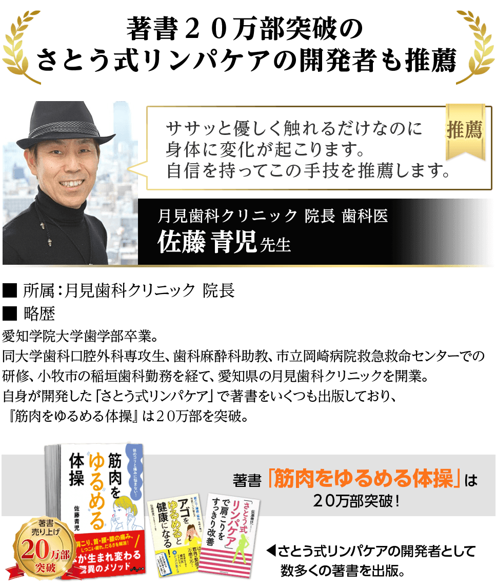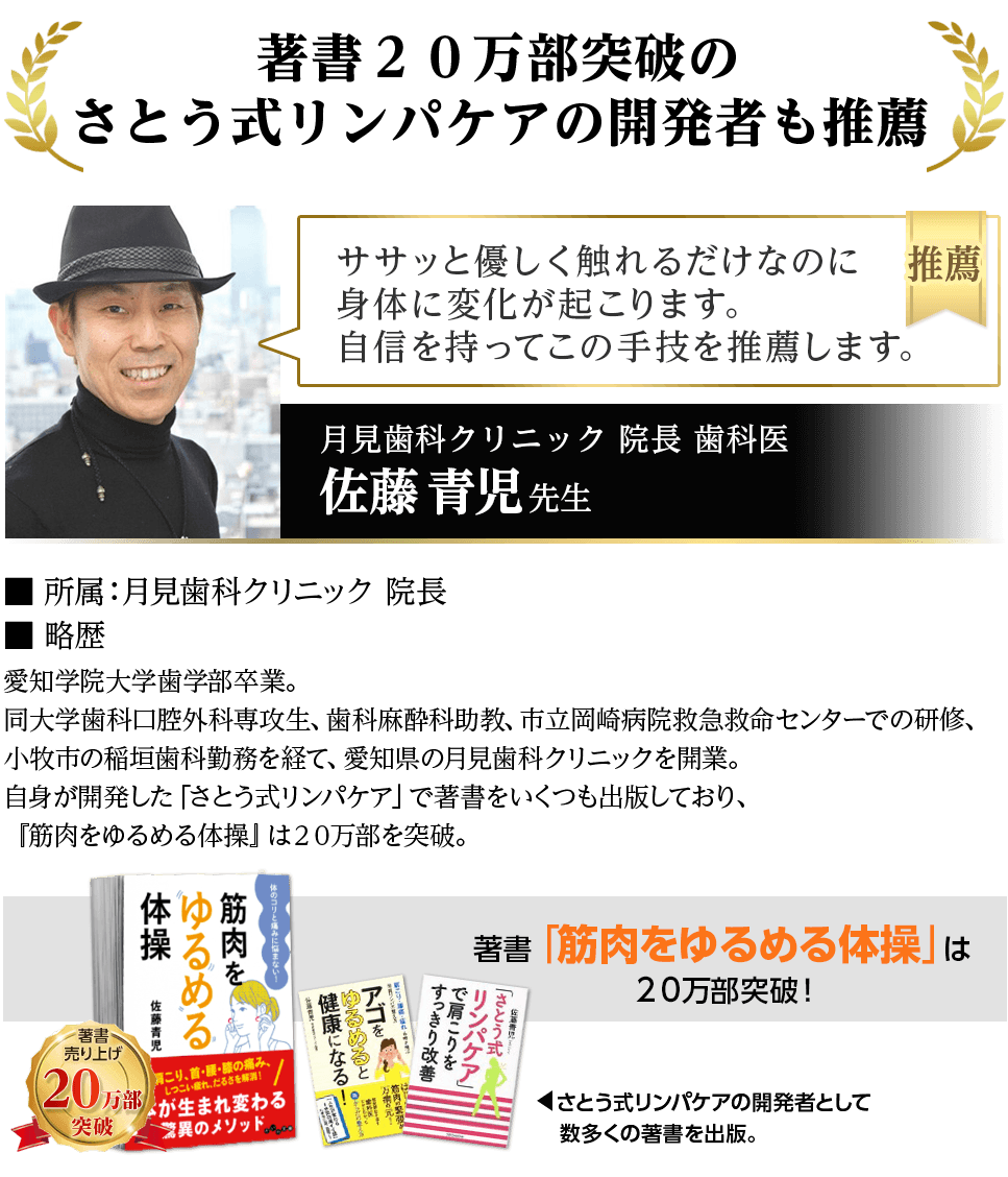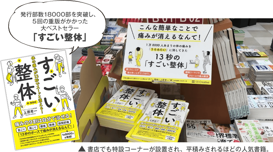 - 一般の方向けにこの治療法のセルフケア法をまとめた書籍、『すごい整体』は、発行部数18,000部を突破。初版から1年以上経過した今でも売れ続け、重版が5回もかかるほどのメガヒットに。