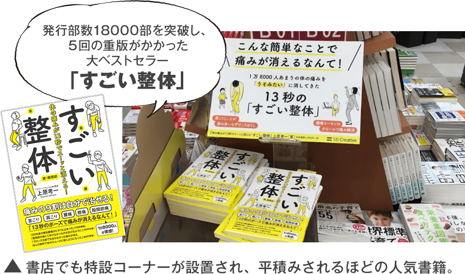- 一般の方向けにこの治療法のセルフケア法をまとめた書籍、『すごい整体』は、発行部数18,000部を突破。初版から1年以上経過した今でも売れ続け、重版が5回もかかるほどのメガヒットに。