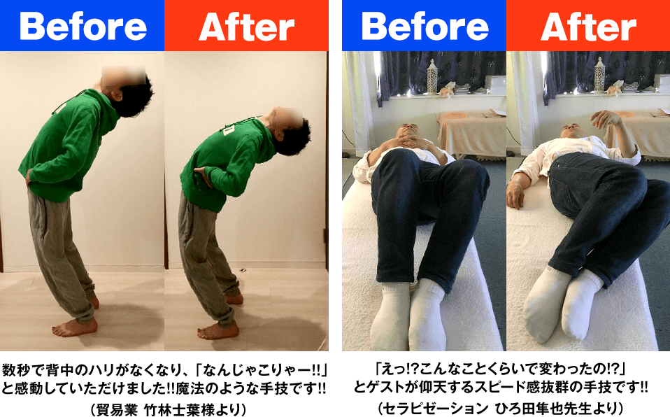 「え、なんでたったコレだけで治るの?」「魔法ですか!?」とこの手技を知った治療家や患者さんが誰しも驚くように、これまでの医学・整体の常識では考えられてこなかった…”全く新しい方法”で痛みをとることが実現しました。