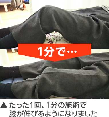 ところが、この手技を試してみたところたった1回…1分の施術で、屈曲90度以上、伸展 10度近くまで動かすことができました。
